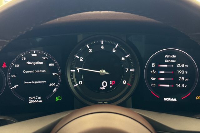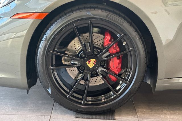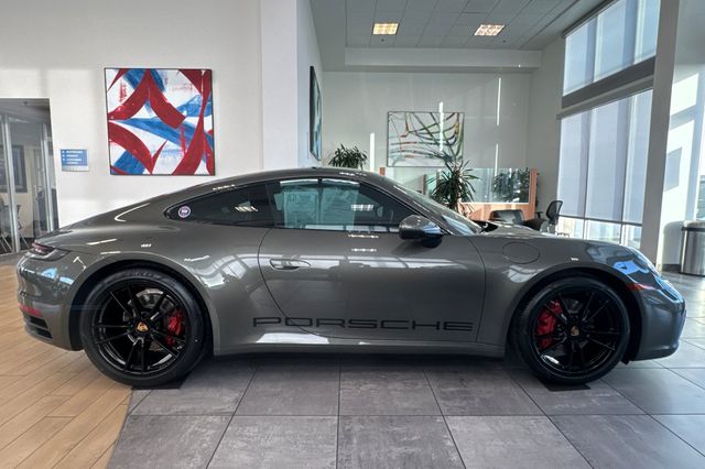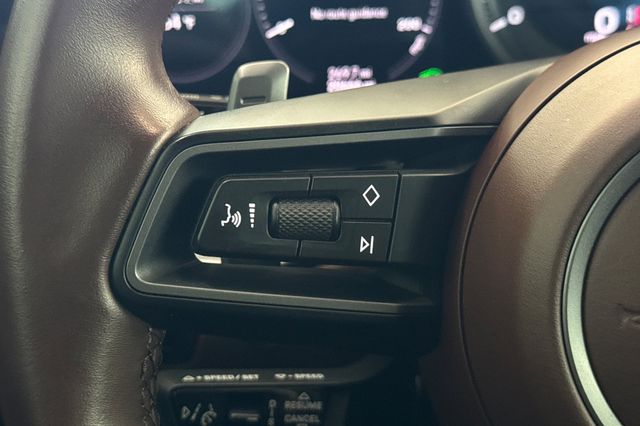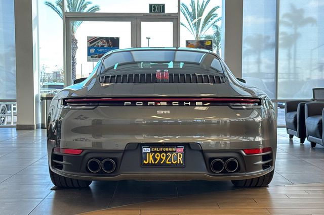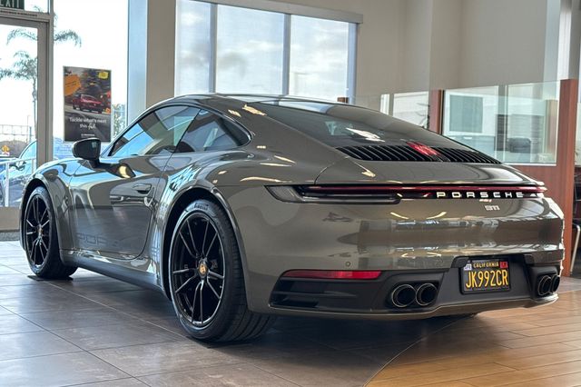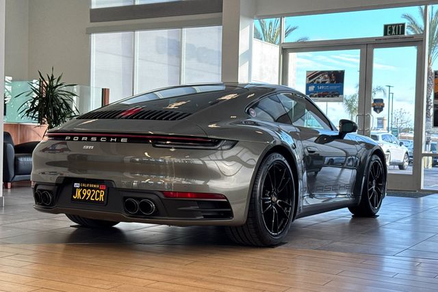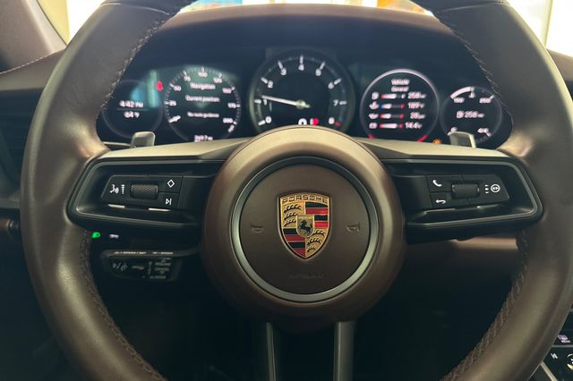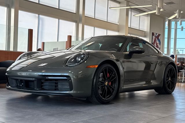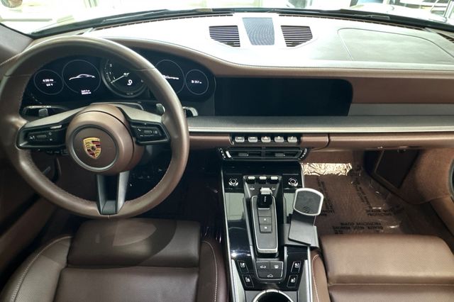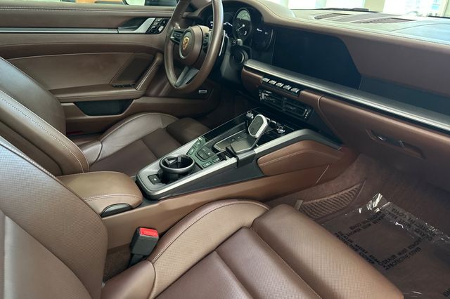 Get your dream car here. This is one smooth looking and driving 2021 Porsche 911 Carrera. It's powered by a twin-turbocharged 3.0L H6 that makes a healthy 379hp, more than enough for this 3,400 LB car. The color is called Aventurine Green Metallic but it's more like a medium Gray color. The interior has the upgrade Club leather sport seats in Truffle Brown with Chalk colored stitching and seat belts for a luxury look and feel. The 8-speed PKD transmission knows what gear it needs to be in, but you're welcome to shift it manually if you wish. It's equipped with the Premium Package which includes Power folding mirrors, ambient interior lighting, the BOSE surround sound system that has wireless Apple Carplay & Android Auto capability, navigation, vented, heated, and power operated front seats, plus a pair of seats in back for those rare occasions that you want to bring along a couple more people. Also included is the surround view camera, the storage package, Lane change assist, the PDLS+ which is the Porsche Dynamic Light System Plus. Other options include a electric tilt/slide sunroof in glass, silver window trim and sport tailpipes in silver, the 23.7 gal extended range fuel tank, wheel center caps with colored Porsche crests, 14-way seats with memory, Porsche crests on the headrests, and Porsche InnoDrive which includes adaptive cruise control and active lane keep assist. There is a new set of Pirelli P ZERO tires for you to burn off, and two keys are included too.