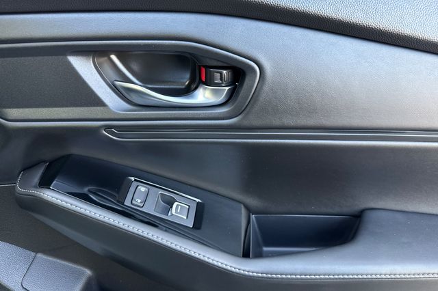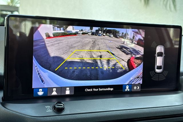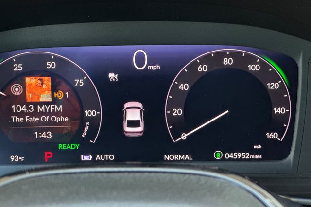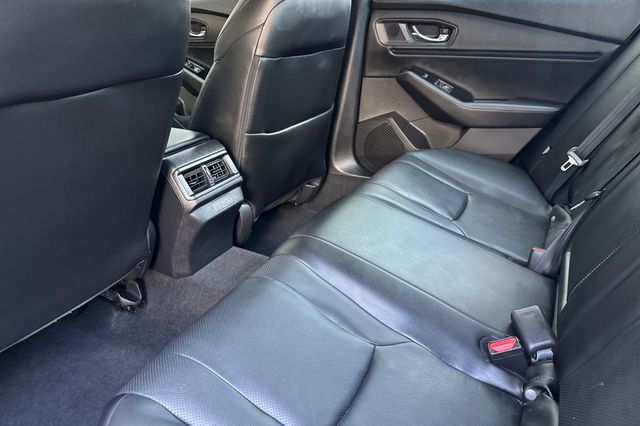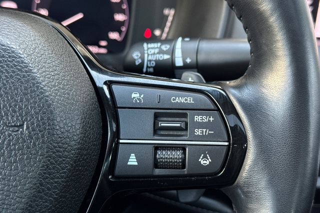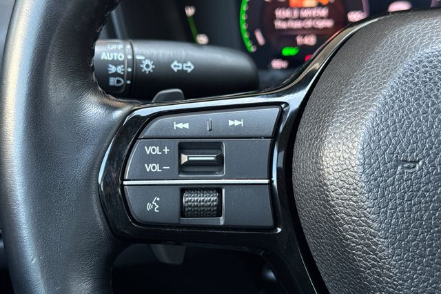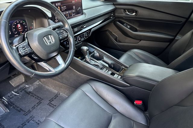 Certified. 2023 Honda Accord Hybrid Touring. It's powered by two electric motors, plus a 2.0L DOHC16V ICE engine. There is regenerative braking that you control with paddles on it's leather wrapped steering wheel. Outside it's Platinum White Pearl with Black alloy wheels, and LED headlights that help you see better in the dark. Inside are vented, heated and powered Black leather seats with memory for the driver's seat. Even the outboard rear seats are heated. There's a 12.2'' touch screen BOSE Premium audio system with wireless Apple Carplay/Andorid Auto/phone charging capability, google maps, blind spot alerts in the heated mirrors, a HEAD up instrument display that shows you important information reflected right on the windshield., a power moonroof, backup camera with cross traffic alert, front & rear parking sensors, rain sensing wipers, smart entry keys with remote starting, and more.