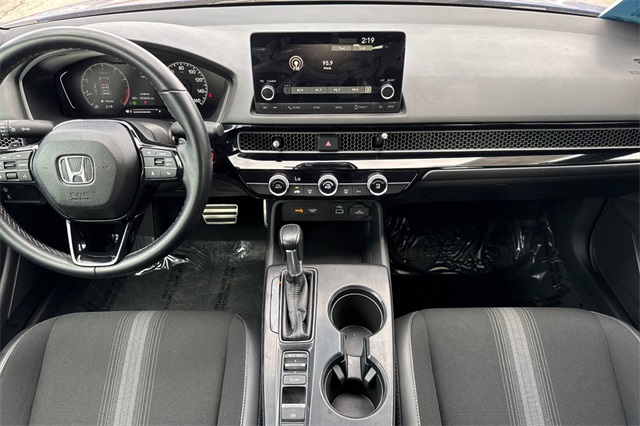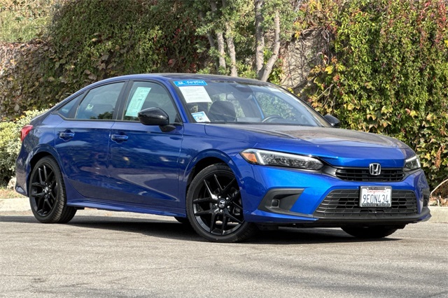 Certified. 2023 Honda Civic Sport Sedan in Aegean Blue Metallic. A one owner locally leased car powered by a 2.0L i-VTEC engine and an automatic transmission with paddle shifters on it's leather wrapped steering wheel. It's got Black cloth trim, an 8-speaker audio system with Apple Carplay and Android Auto capability, adaptive cruise control, lane keeping assist, forward collision warning & braking, 18" black alloy wheels, LED headlights, remote starting, a 3-view backup camera, a fold down rear seatback, and more