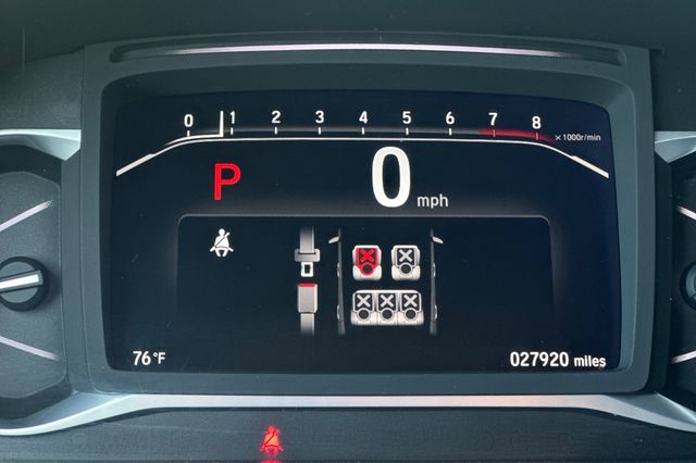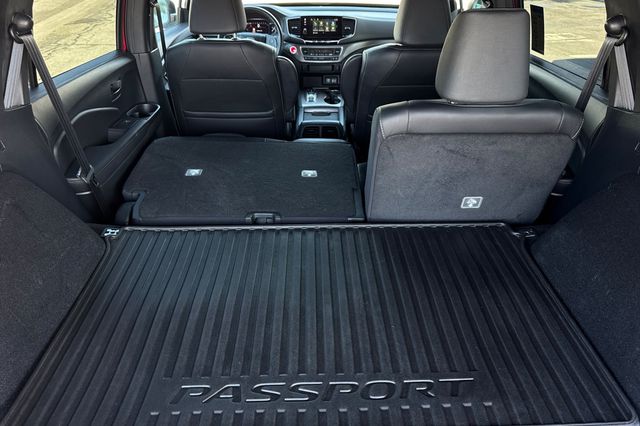 2023 Honda Passport EX-L. Impulsado por el motor V6 de 3.5L con 280HP, no el turbo de 4 cilindros. Exterior Radiant Red Metallic II con interior Black leather. Transmision automatica de 9 velocidades con traccion 4WD. Los asientos delanteros son calefaccionados y electricos, asiento trasero plegable 60/40 para aumentar espacio de carga. Incluye porton trasero electrico hands-free, techo corredizo panoramico con parasol, arranque remoto. El paquete de tecnologia incluye sistema de navegacion activado por voz, monitores de punto ciego en espejos calefaccionados, Honda Sensing con advertencia de colision frontal, advertencia de cambio de carril, control de crucero adaptativo y camara de reversa. Faros LED automaticos, espejos auto-dimming. 27,903 millas - millaje bajo promedio. $37,988. Contact Freeway Honda to schedule your test drive.