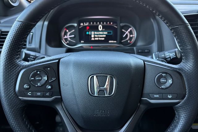 2023 Honda Passport EX-L. Equipado con motor V6 de 3.5L que genera 280HP, no el turbo de 4 cilindros. Es Sonic Gray Pearl por fuera con tapiceria Black leather por dentro. Los asientos delanteros son calefaccionados y electricos, el asiento trasero espacioso tiene respaldo dividido/plegable para aumentar el espacio de carga. Incluye porton trasero electrico manos libres, techo panoramico con persiana solar, arranque remoto. Sistema de traccion 4WD con transmision automatica de 9 velocidades. El paquete de tecnologia incluye camara de reversa, monitoreo de punto ciego, alerta de cambio de carril, advertencia de colision frontal, y control de crucero adaptativo. Fabricado en Estados Unidos. 35,435 millas, $31,988. Contact Freeway Honda to schedule your test drive.