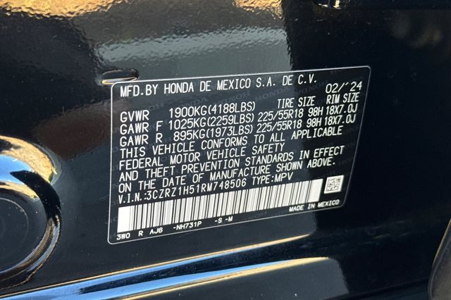 Certified. 2024 Honda HR-V Sport. It's powered by the i-VTEC 2.0L 4-cylinder with automatic transmission and front-wheel drive. It's Crystal Black Pearl outside with Black Cloth interior. This one shows just 19,172 miles, well below average for the model year. Safety tech includes blind spot monitors in the heated outside mirrors, a 3-view backup camera with cross traffic alert, lane departure warning, forward collision warning, and adaptive cruise control for highway driving. The HR-V Sport delivers excellent fuel economy with the naturally aspirated engine and continuously variable transmission. Inside you'll find cloth seating, cargo area for weekend gear, and Honda's infotainment system. The compact SUV footprint makes city parking easy while maintaining interior space. Priced at $27,988. Contact Freeway Honda to schedule your test drive.