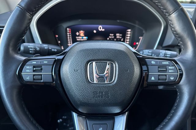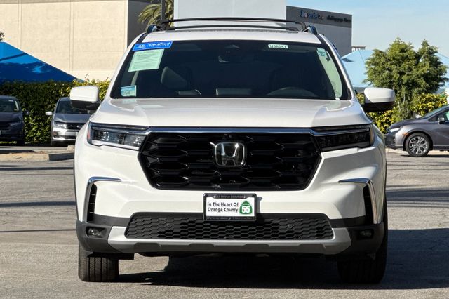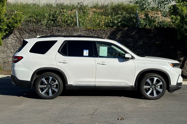 2024 Honda Pilot ELITE. Equipado con motor V6 de 3.5L con 285HP y transmision automatica de 10 velocidades con traccion 4WD. Exterior en Platinum White Pearl con interior de Black leather. Incluye asientos delanteros con calefaccion y ajuste electrico, asientos traseros de segunda y tercera fila abatibles. Cuenta con porton trasero electrico manos libres, techo panoramico con parasol, arranque remoto. El paquete tecnologico incluye sistema de navegacion activado por voz, monitores de punto ciego en espejos con calefaccion, camara de reversa, advertencia de cambio de carril, advertencia de colision frontal, control crucero adaptativo. Espejos auto-oscurecibles y pantalla tactil de infotainment. 31,235 millas, $45,988. Fabricado en Estados Unidos. Contact Freeway Honda to schedule your test drive.